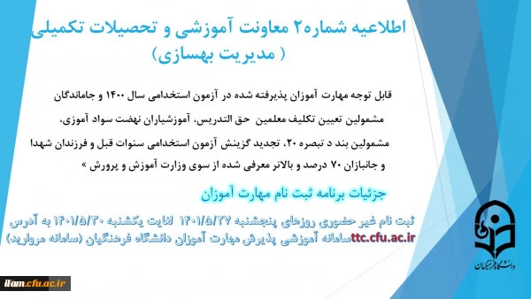 اطلاعیه شماره2 معاونت آموزشی ( مدیریت بهسازی) زمان بندی ثبت نام غیر حضوری و حضوری از مهارت آموزان پذیرفته شده در آزمون استخدامی سال 1400 و سایر جاماندگان اعلام شد. 2