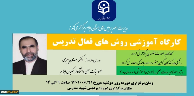 امتیاز دهید : برگزاری کارگاه آموزشی روش های فعال تدریس در دانشگاه فرهنگیان استان ایلام 2 سهشنبه 22 شهریور 1401 ساعت 22:56