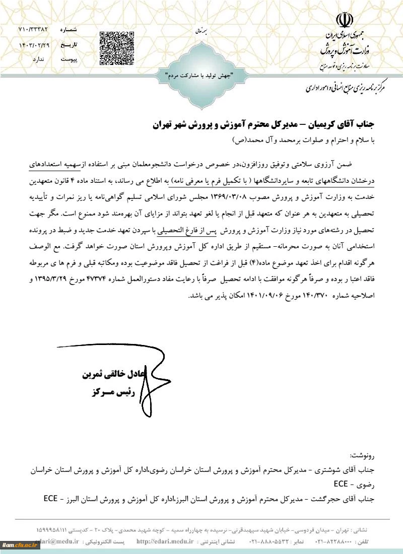 بخشنامه ممنوعیت ادامه تحصیل دانشجو معلمان تا قبل از دانش آموختگی از دانشگاه فرهنگیان 2