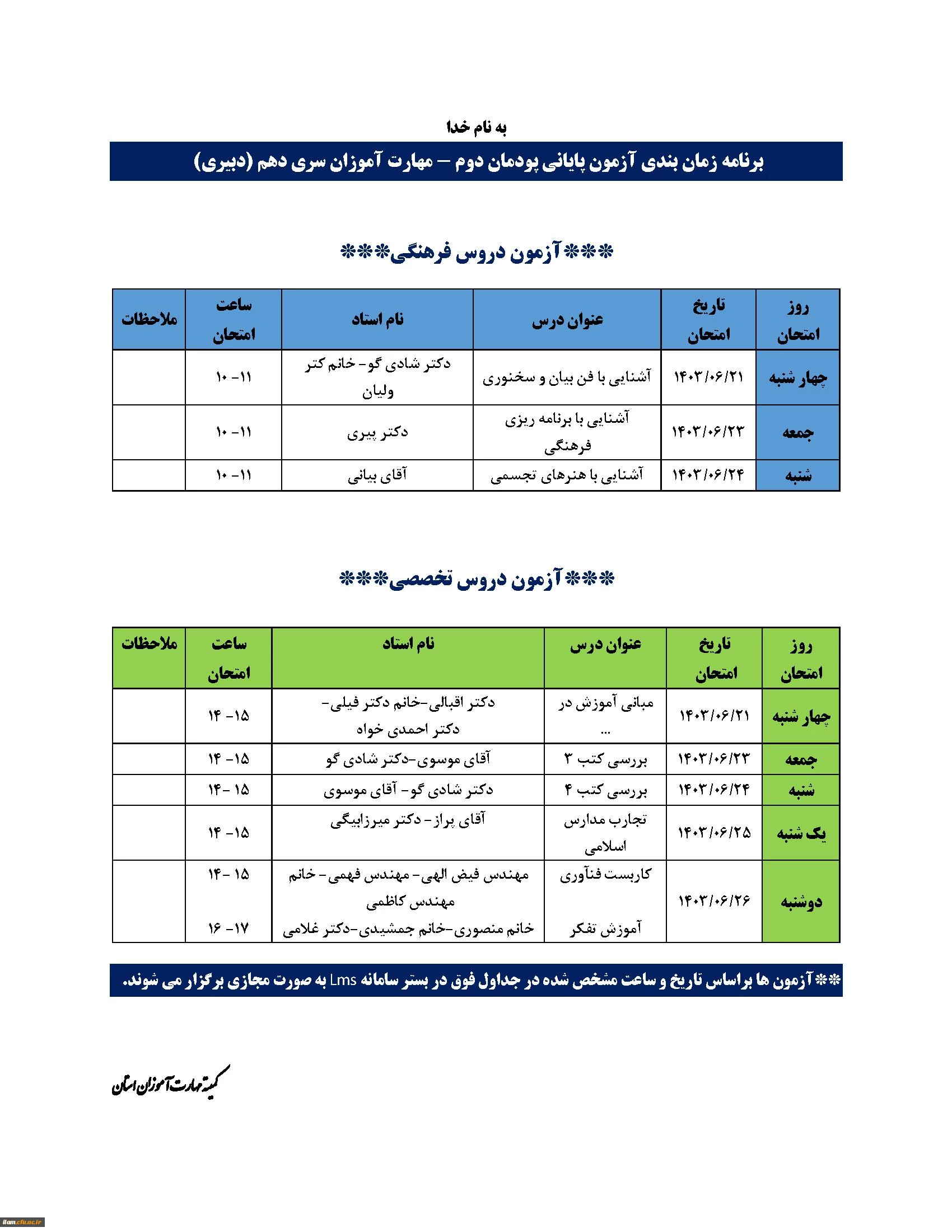 امتیاز دهید : برنامه امتحانات پودمان دوم مهارت آموزان ماده 28 آموزش متوسطه سری دهم 2 دوشنبه 19 شهریور 1403 ساعت 15:20