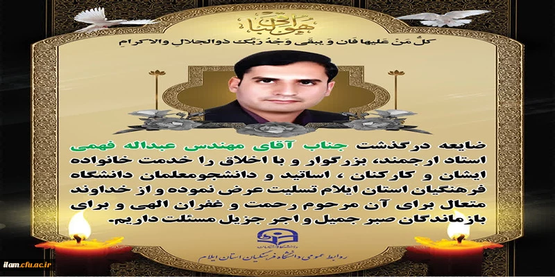 درگذشت نابهنگام شادروان مهندس عبداله فهمی رئیس فقید حراست دانشگاه فرهنگیان استان ایلام را تسلیت عرض می نمائیم. 2