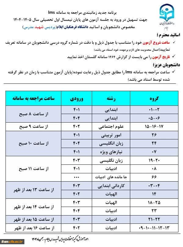 رنامه زمانبندی مراجعه به سامانه جهت شرکت در آزمون های پایان نیمسال اول سال تحصیلی ۱۴۰۵-۱۴۰۴ پردیس شهید مدرس 2